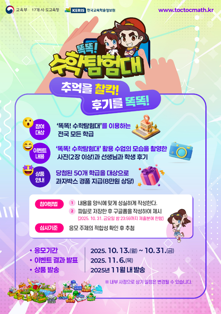 - 참가자격 : '똑똑! 수학탐험대'를 이용하는 전국 모든 학급